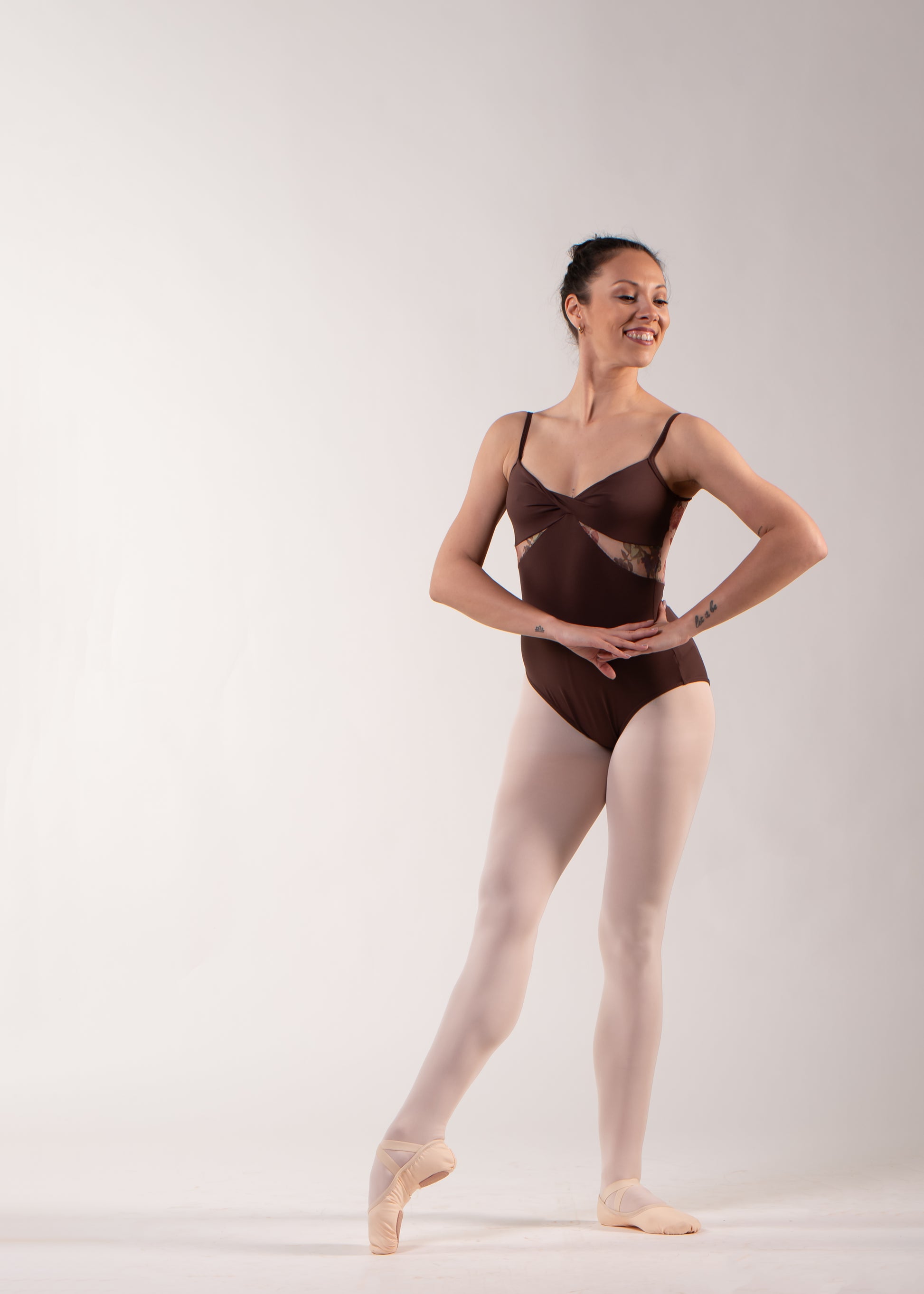Colección ''Flores''. Este elegante leotardo está hecho de Meryl y Lycra con detalles de malla floral en la parte delantera y trasera.